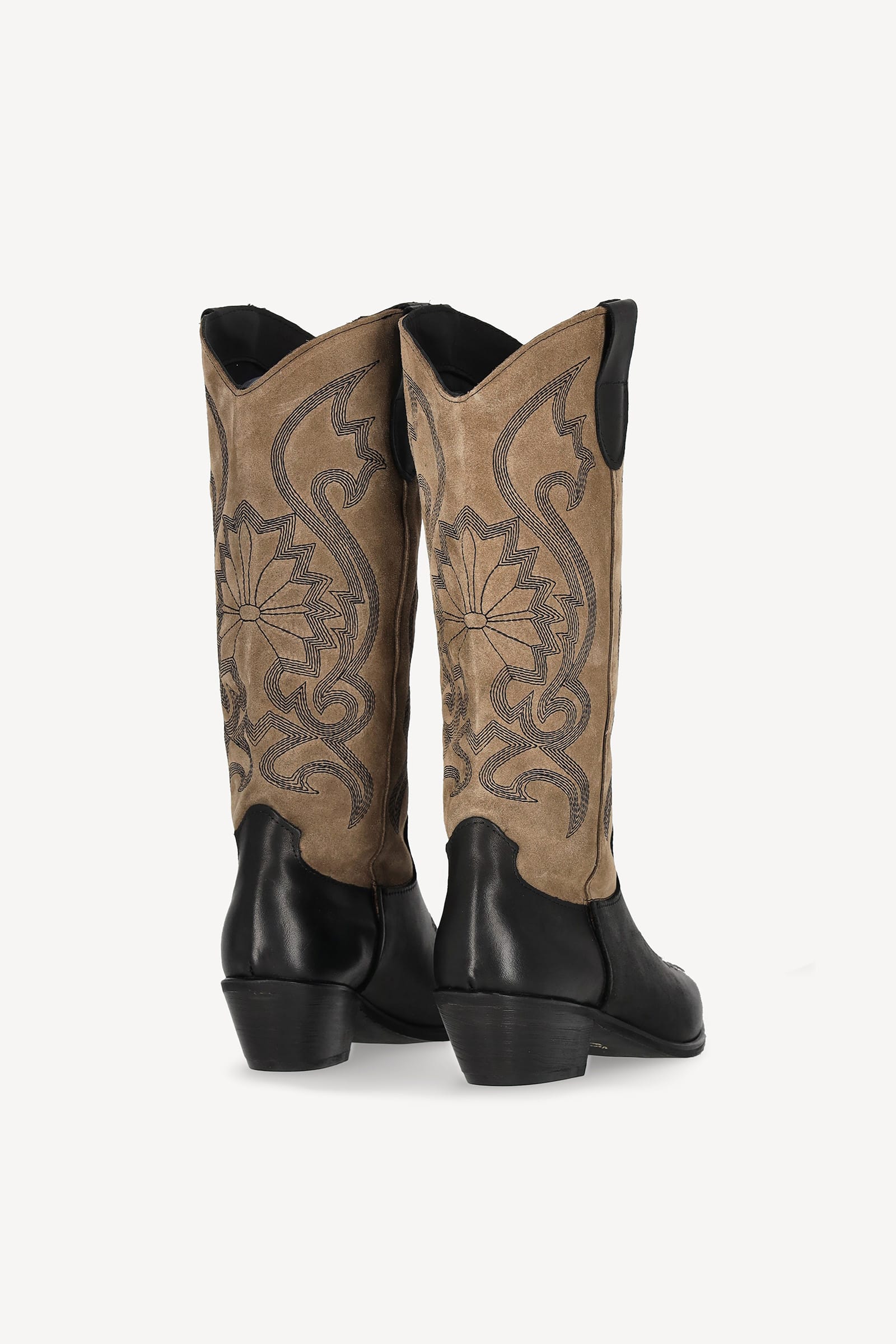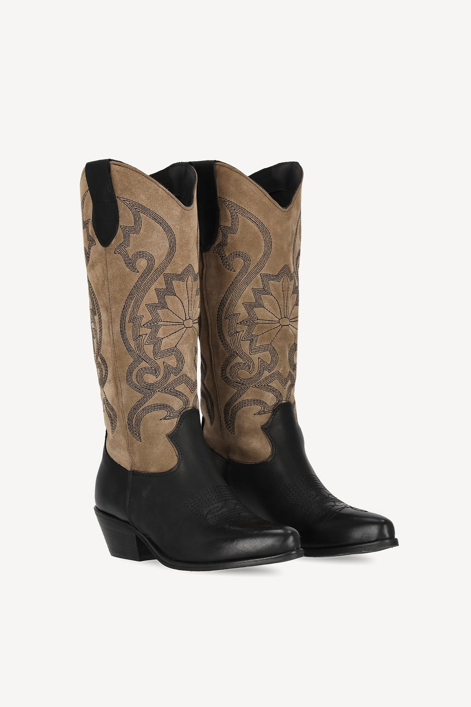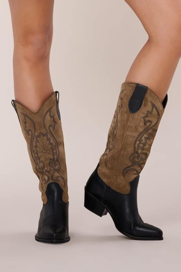 Buty kowbojki wykonane z dwóch różnych skór czarnej licowej i zamszowej w kolorze brązu, ozdobione kontrastowym haftem. Buty na typowym dla tego modelu lekko ściętym obcasie wysokość 5 cm wysokość cholewki 33 cm. Model idealny do sukienek w stylu vintage.