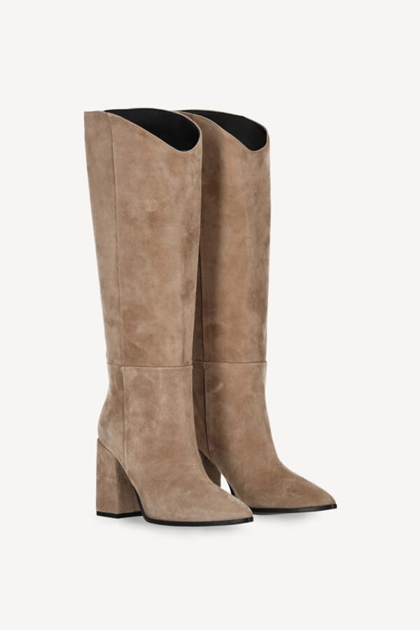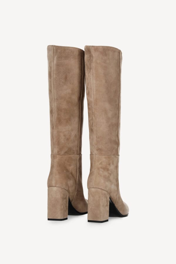 Kozaki długie zamszowe na słupku, cholewka lekko ścięta dość szeroka. W środku ocieplane pianką, model nie posiada suwaka.