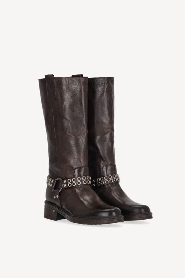 Kozaki wykonane z wysokiej jakości włoskiej skóry licowej. Środek buta także wyściełany miękką skórą. Model bez suwaka, cholewka jest na tyle szeroka, że można je swobodnie włożyć. Dodatkowo kozaki posiadają dekoracyjny pasek otulający kostkę.