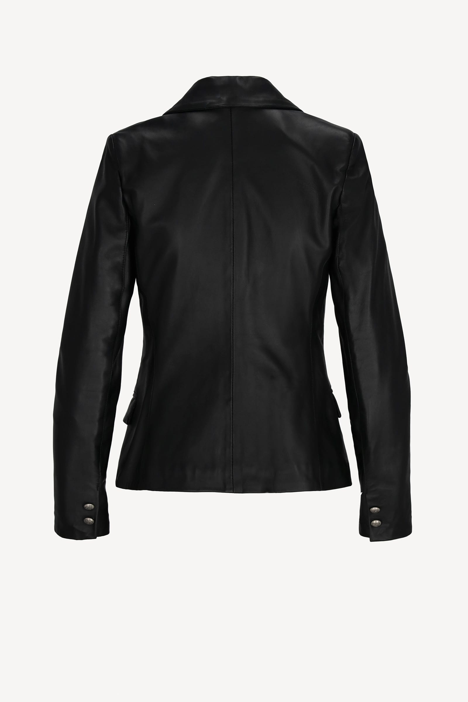Marynarka skórzana wykonana z wysokiej jakości jagnięcej skóry. Model klasyczny lekko dopasowany w talii z przodu dwie ukryte kieszenie. Zapinana na dwurzędowe srebrne guzik wykładany kołnierz z tyłu rozcięcie. Świetnie sprawdzi się do długich spódnic lub klasycznego zestawienia ze spodniami.