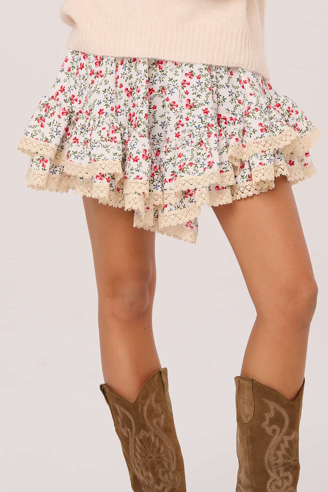 Spódniczka krótka uszyta z koła wykończona podwójnymi nakładającymi się na siebie falbankami asymetrycznymi, w całości obszyte kontrastową bawełnianą koronką by nadać stylu Vintage. Spódniczka na gumce idealna do wełnianych swetrów w stylizacjach jesiennych.