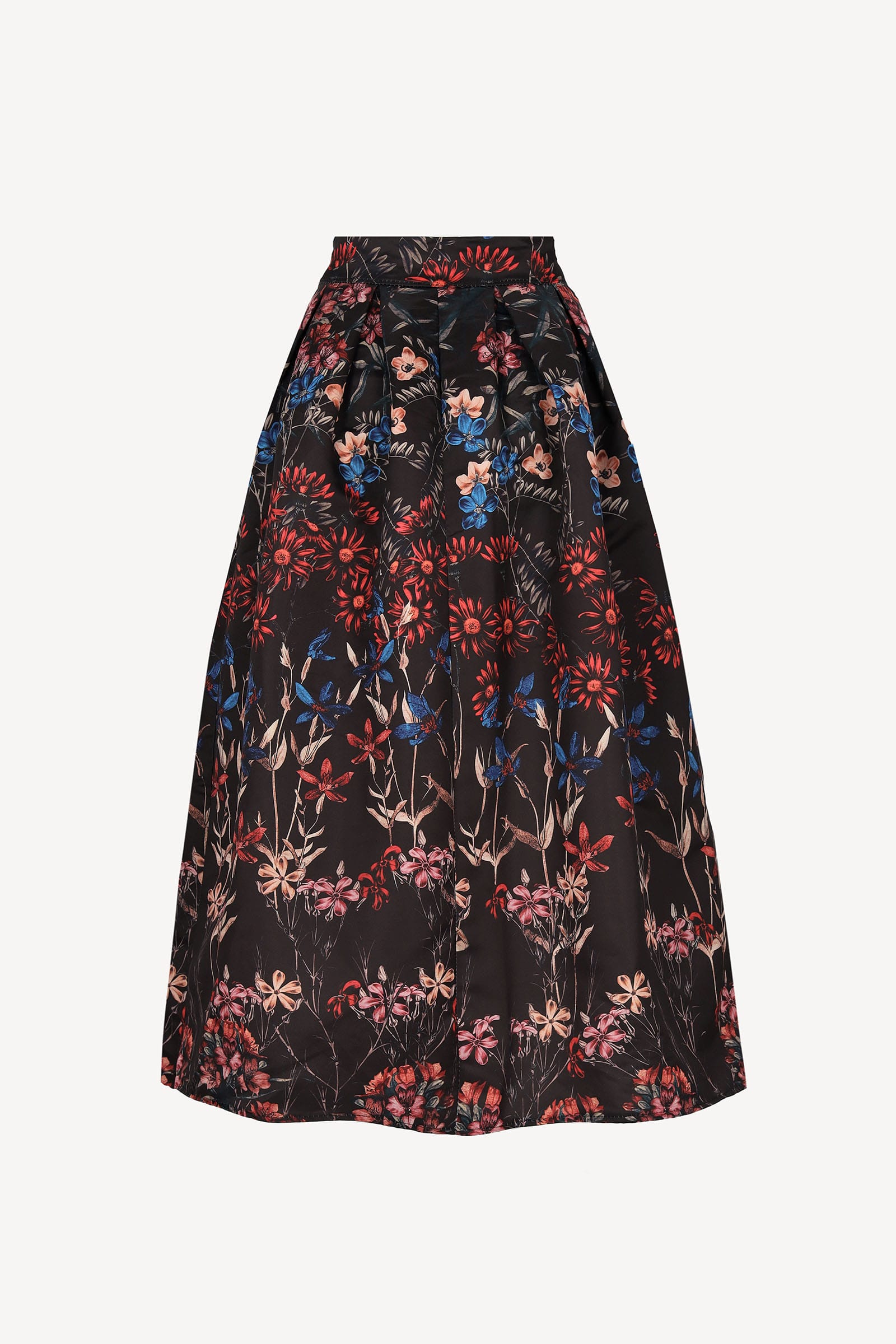 Spektakularna spódnica maxi, uszyta z połyskującej tkaniny w orginalny kwiatowy print. Model rozkloszowany, z kontrafałdą. W talii szeroki pas, dodatkowo z tyłu suwak. Przód ozdobiony aplikacją z błyszczących cekinów.