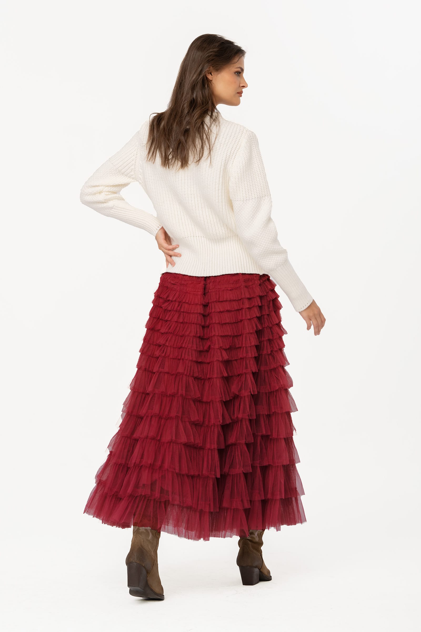 Spódnica tiulowa uszyta ze stopniowanych falban przez co model jest bardzo zgrabny nie poszerzający. Góra spódnicy na gumce idealny model by cały rok bawić się stylizacją. Spódnica posiada podszewkę, zestawiona z kowbojkami stworzy casualowy look, do klasycznych szpilek i lejącej koszuli styl elegancki.