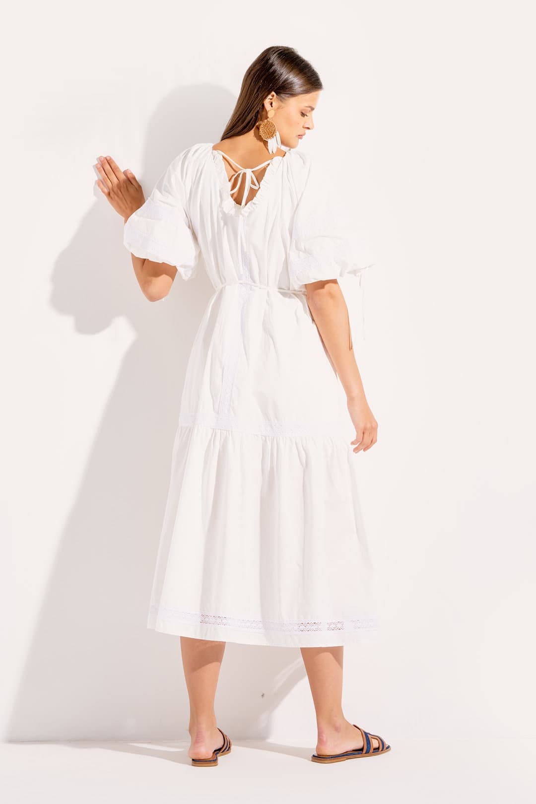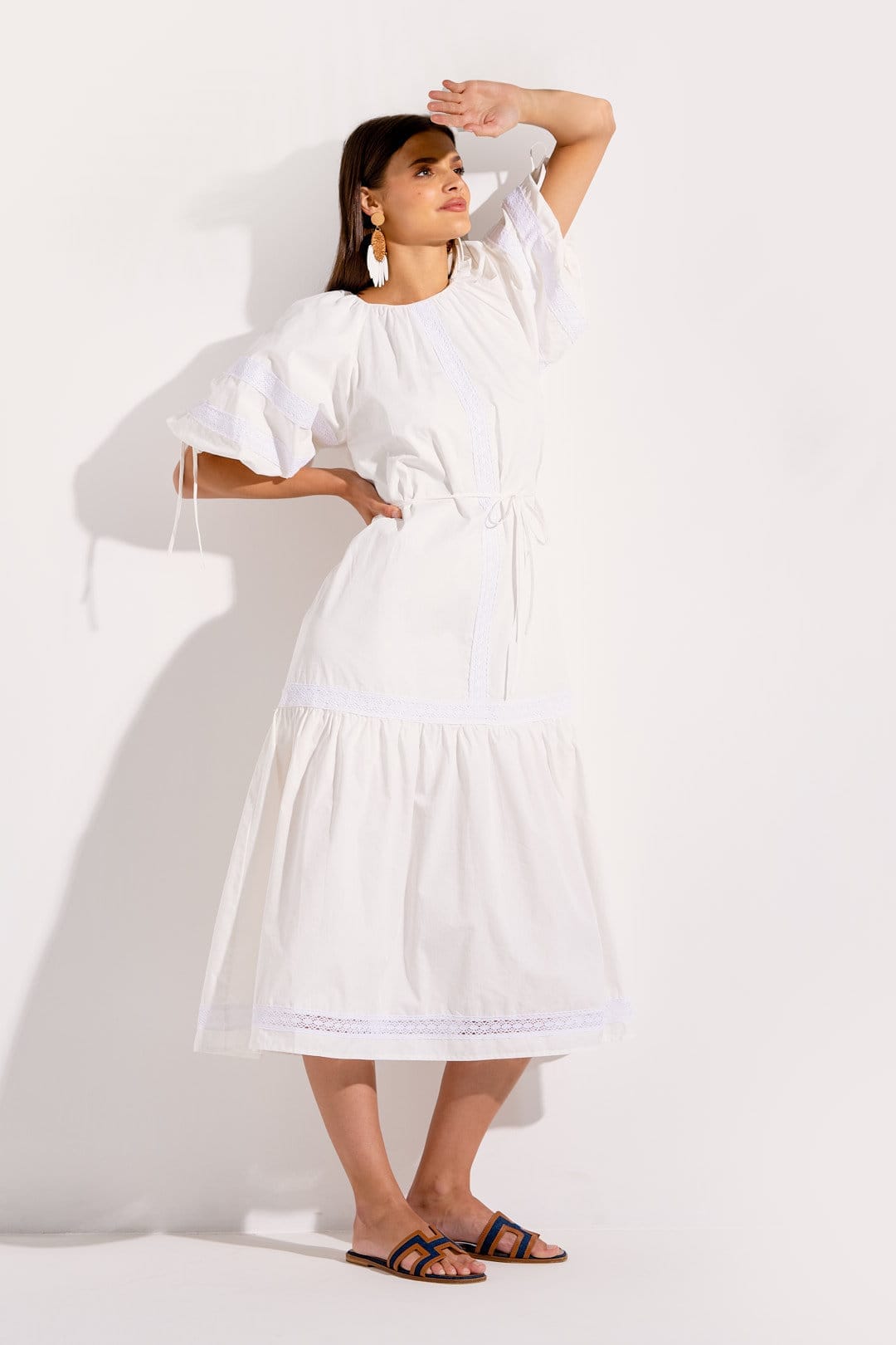 Sukienka Alisa usyta z wysokiej jakości bawełny ozdobionej bawełnianą koronką, model boho. Rękawki krótkie bufiaste wiązane na troczki. Sukienka o kroju oversize dodatkowo cienki pasek którym podkreślisz talię. Tył sukienki wiązany możliwość regulacji dekoltu.