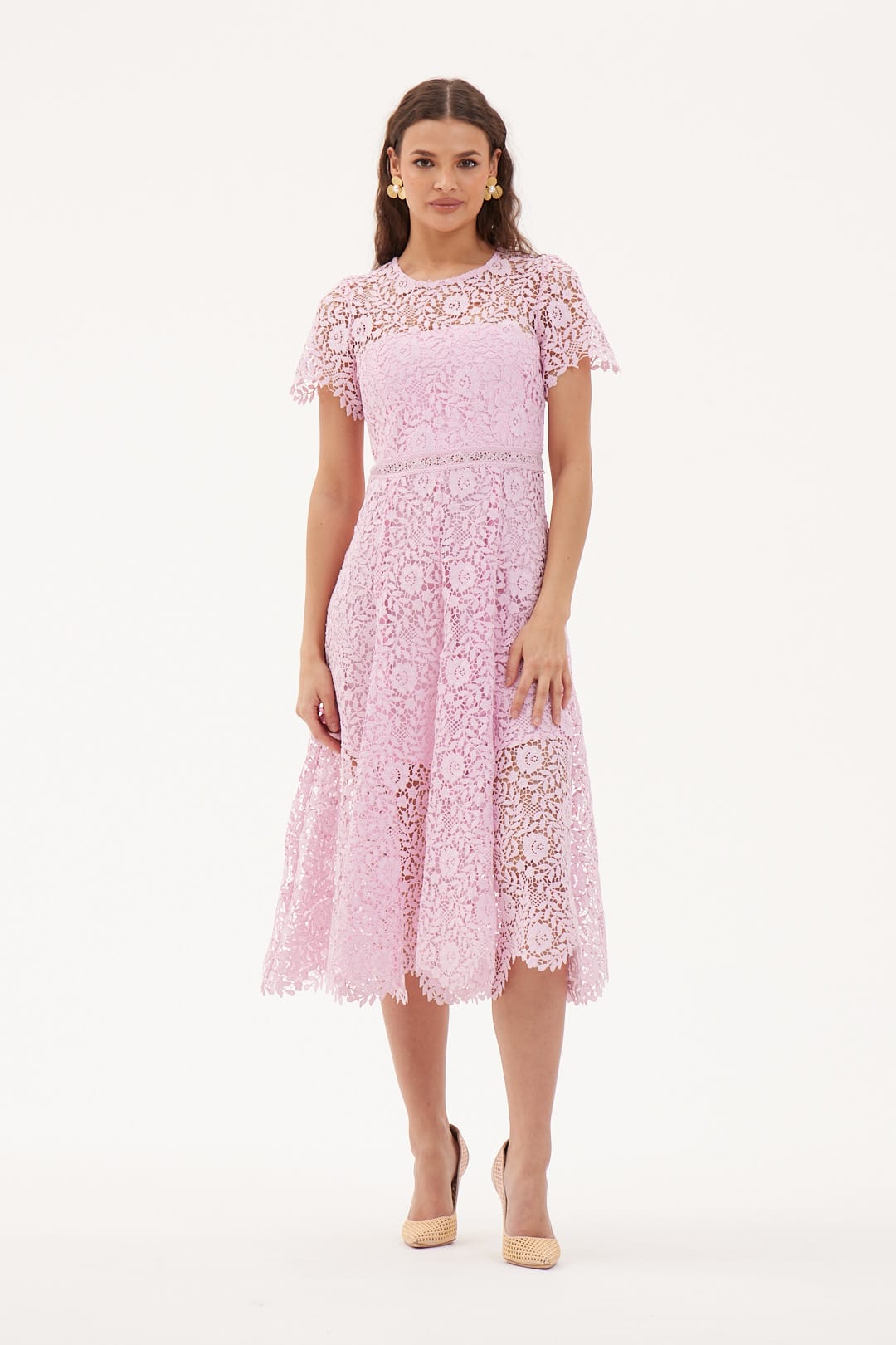 Sukienka Awena uszyta z wysokiej jakości gipiurowej koronki. Model dopasowany do ciała dół lekko rozkloszowany, rękawki krótkie. Sukienka zasuwana na kryty suwak z tyłu, posiada podszewkę.