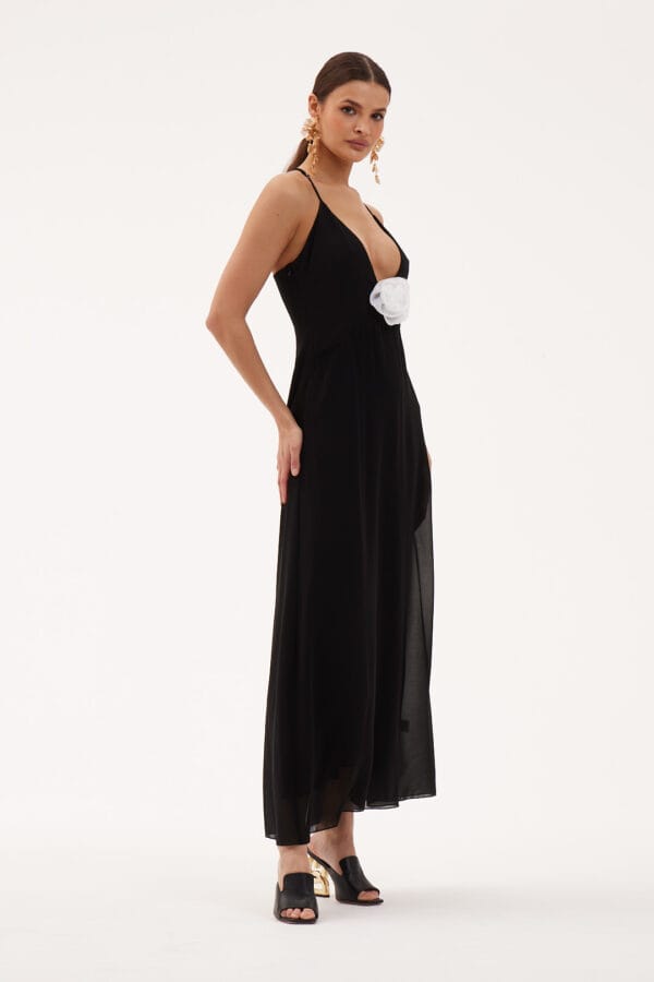 Sukienka midi model zwiewnej halki, góra na cienkich ramiączkach z regulacją. W talii lekko dopasowana dół opływowy zwiewny. Dodatkowo kontrastowa dopinana róża w kolorze bieli która dodaje charakteru tej sukience.