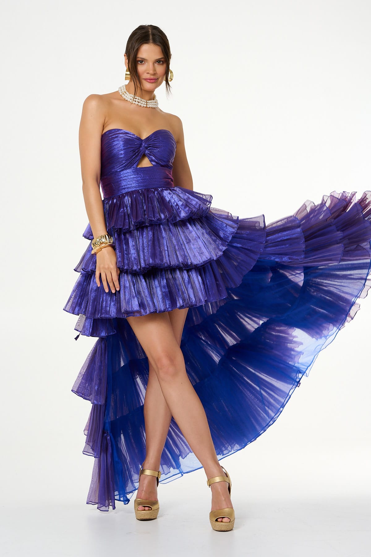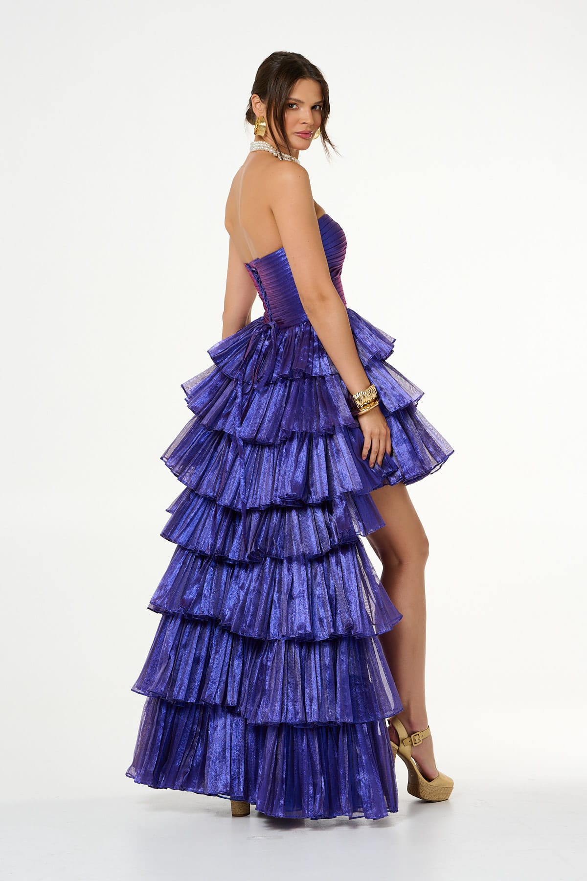Sukienka o spektakularnym kroju w kolorze fioletowym. Góra gorsetowa z efektownym węzłem z przodu delikatnie podkreśla dekolt, dopasowana w talii. Z tyłu do talii zapinana na suwak, a na plecach wiązana. Dół szeroki zamaszysty z plisowanych falban, dodatkowym atutem jest odpinany tren, co umozliwia zmianę stylizacji z wieczorowej na koktajlową. Posiada podszewkę. Idealna na większe uroczystości.