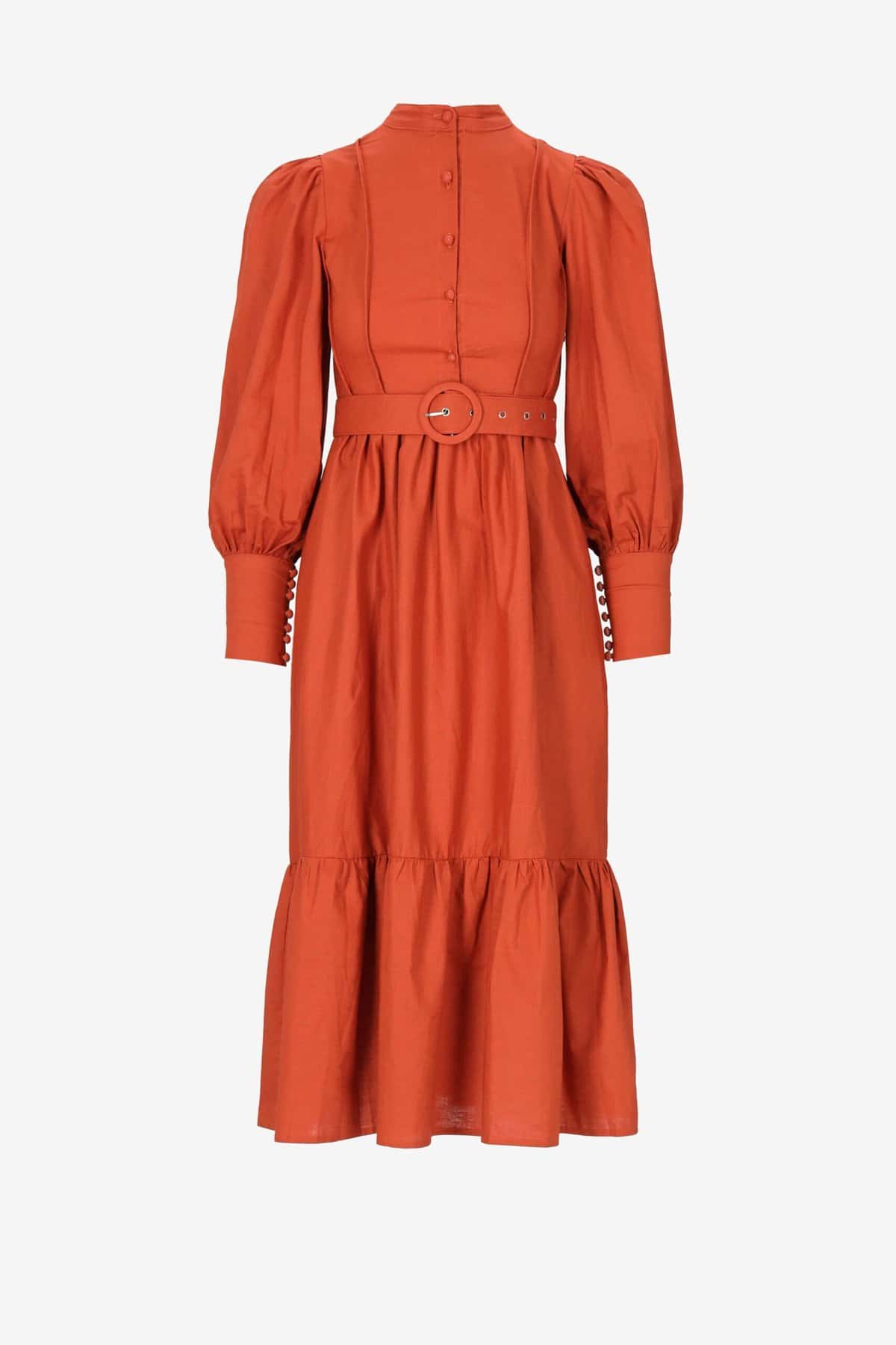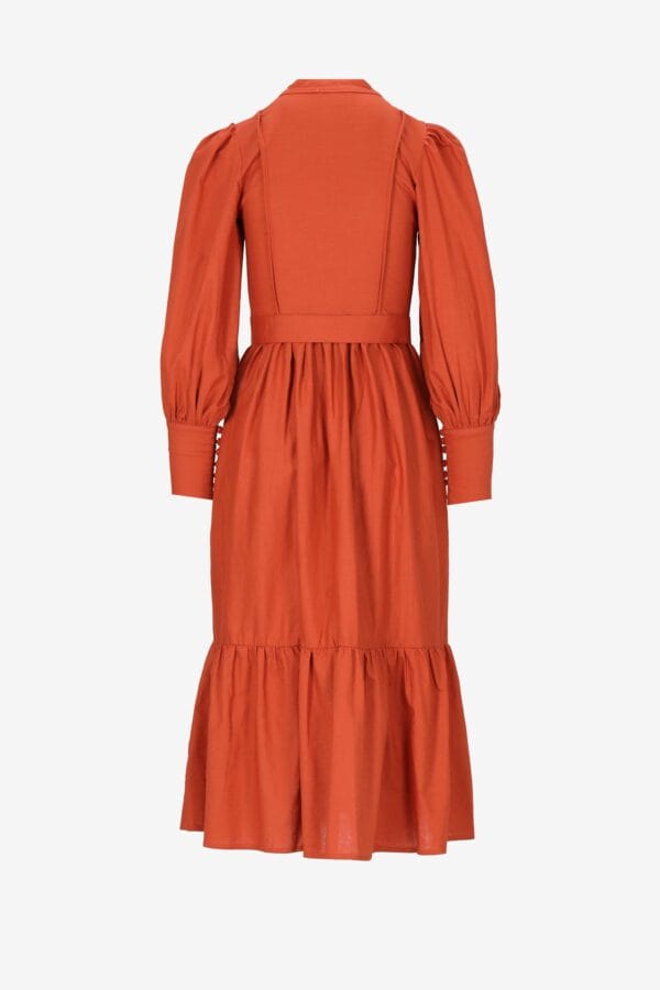 Sukienka midi z pięknymi aplikacjami z koronki oraz falbanami. Dekolt wykończony kołnierzem, w pasie odcinana lekko taliowana. Przód zapinany na guziki, rekawy długie z wysokimi mankietami zapinanymi na guziczki. Dodatkowo pasek którym podkreslisz talię.