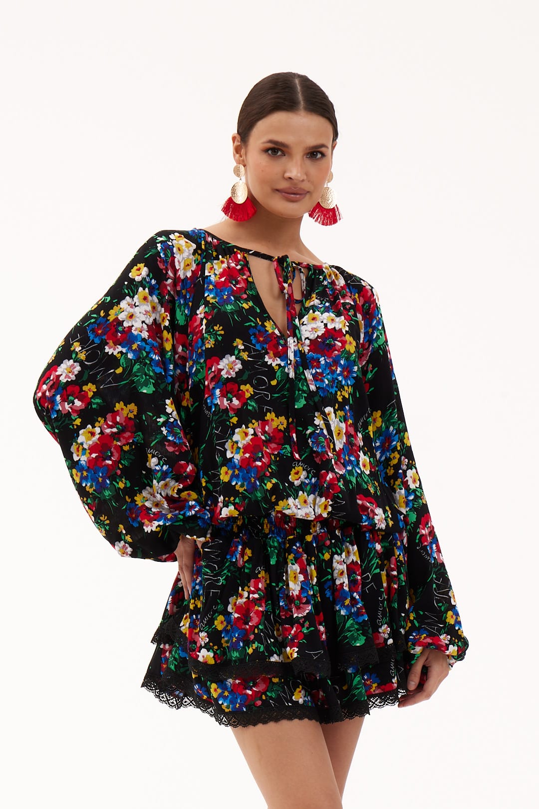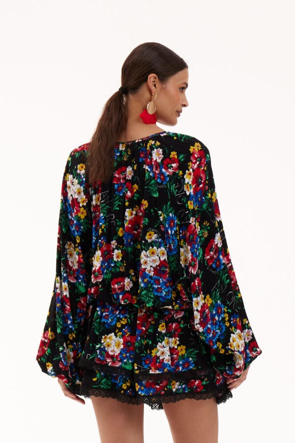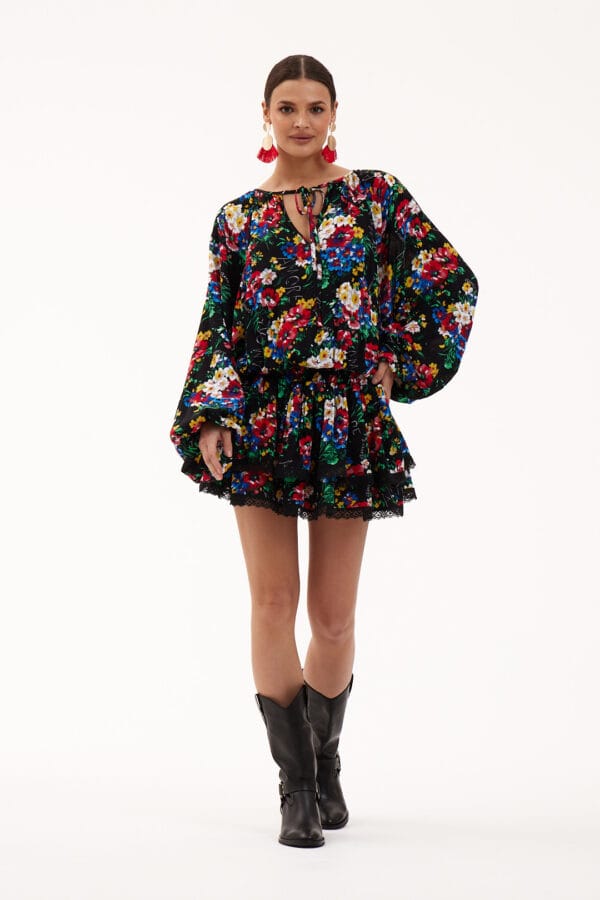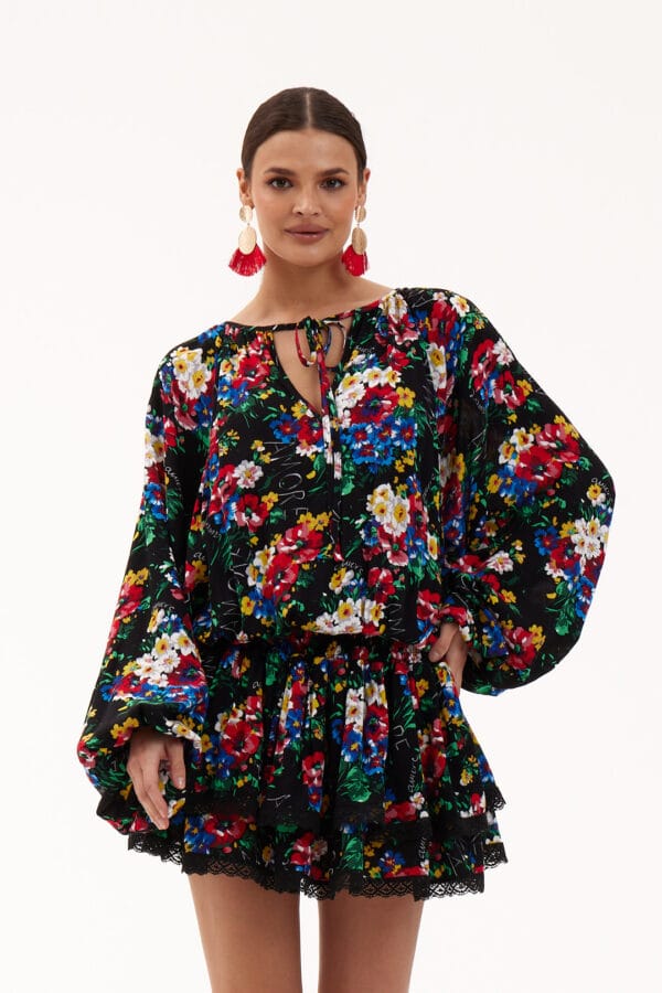 Sukienka mini uszyta z gniecionej wiskozy w kwiatowy print, obszyta bawełnianą koronką. Góra sukienki obszerna z szerokimi rękawami wykończonymi gumką. W pasie gumki podkreślą talię, dół uszyty z warstwowych falban. Idealnie sprawdzi się w duecie z klapkami lub sportowym obuwiem.