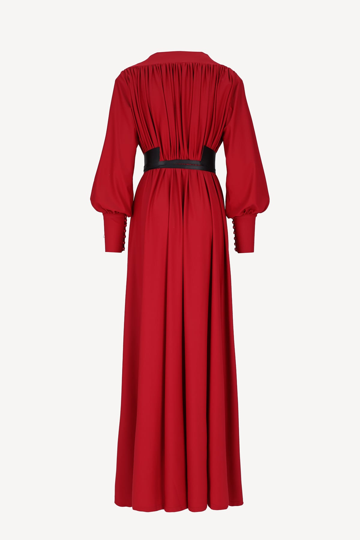 Czerwona sukienka maxi Loretta to propozycja dla kobiet, które kochają elegancję w odważnym, zdecydowanym wydaniu. Głęboki odcień czerwieni pięknie podkreśla charakter modelu, a miękkie marszczenia przy dekolcie i ramionach tworzą subtelną, kobiecą linię. Szeroki czarny pasek wiązany w talii inspirowany stylem obi nadaje całości wyrazistości, doskonale modelując sylwetkę i podkreślając proporcje. Rękawy o lekko bufowanej formie zakończone są eleganckimi mankietami z drobnymi guzikami, które stanowią efektowne wykończenie i dodają całości szlachetności. To sukienka, która łączy kobiecość, mocny kolor i charakterystyczną dla marki Chellena elegancję z lekką nutą orientalnej estetyki. Idealna na wyjątkowe okazje, wieczorne wyjścia i momenty, w których liczy się pewny siebie, zjawiskowy look.
