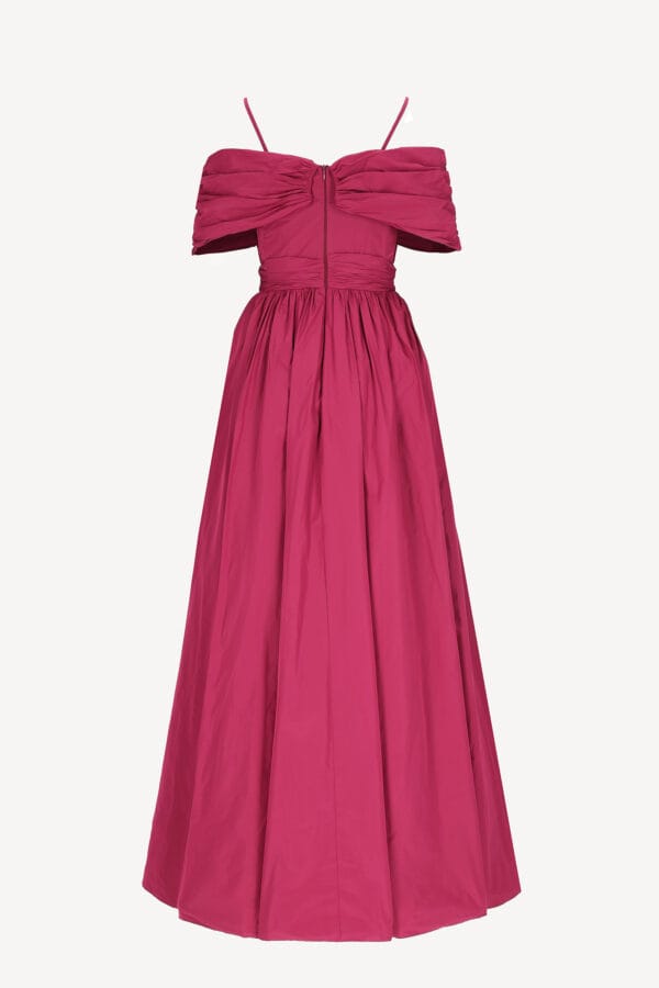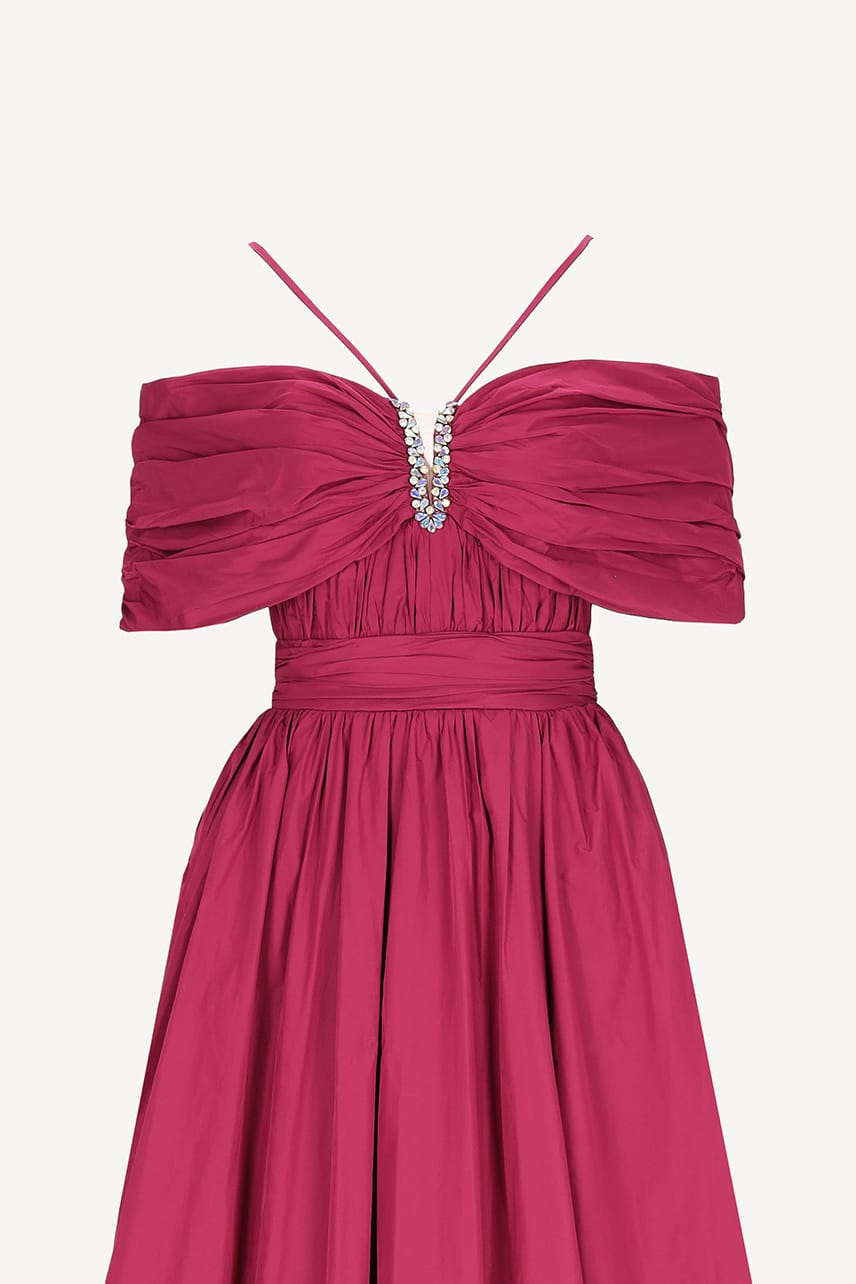 Sukienka maxi o spektakularnym kroju. Przód bogato marszczony, dekolt ozdobiony aplikacją z kolorowych kryształków. Dodatkowo cienkie ramiączka. Model odcinany w talii, dół rozszerzany, z rozporkiem. Posiada podszewkę i dopełniającą warstwę usztywniającą oraz boczne kieszenie. Sukienka idealnie sprawdzi się na wielkie wyjścia, bale czy studniówki.
