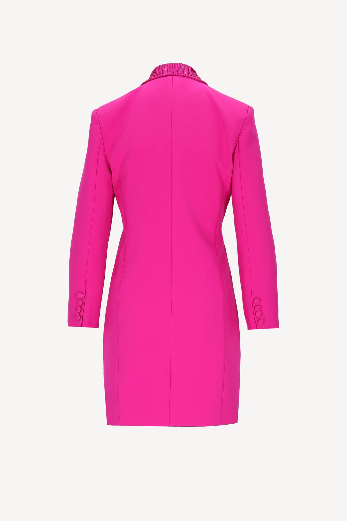 Sukienka ala marynarka o przedłużonym stanie, dekolt marynarkowy ozdobiony cyrkoniami, rękawy długie obszyte piórami, dodatkowo zapięcie wewnątrz marynarki. Świetny model do kozaków.