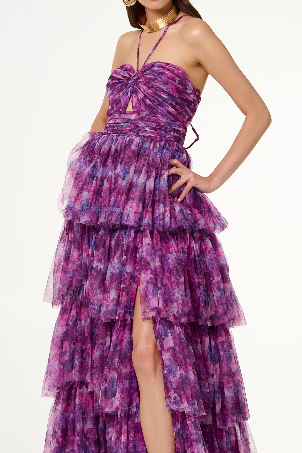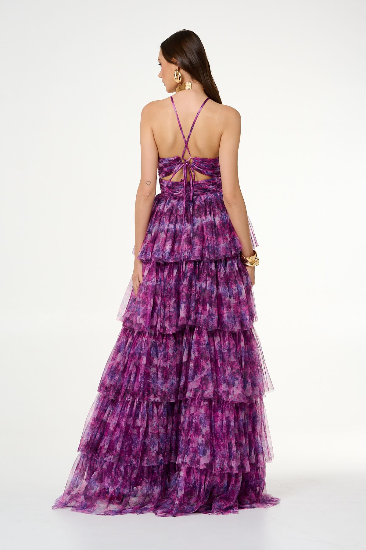 Sukienka maxi o spektakularnym kroju w kolorze fioletowym w kwiatowy print. Gorsetowa góra z drapowaniem i delikatnym wycięciem subtelnie podkreśla dekolt, a cienkie ramiączka dodają lekkości i zmysłowości. Dół wielowarstwowy z kaskadowych falban z widocznym rozporkiem z przodu. Z tyłu zapinana do talii na suwak i wiązana na plecach. Idealna propozycja na większe uroczystości.