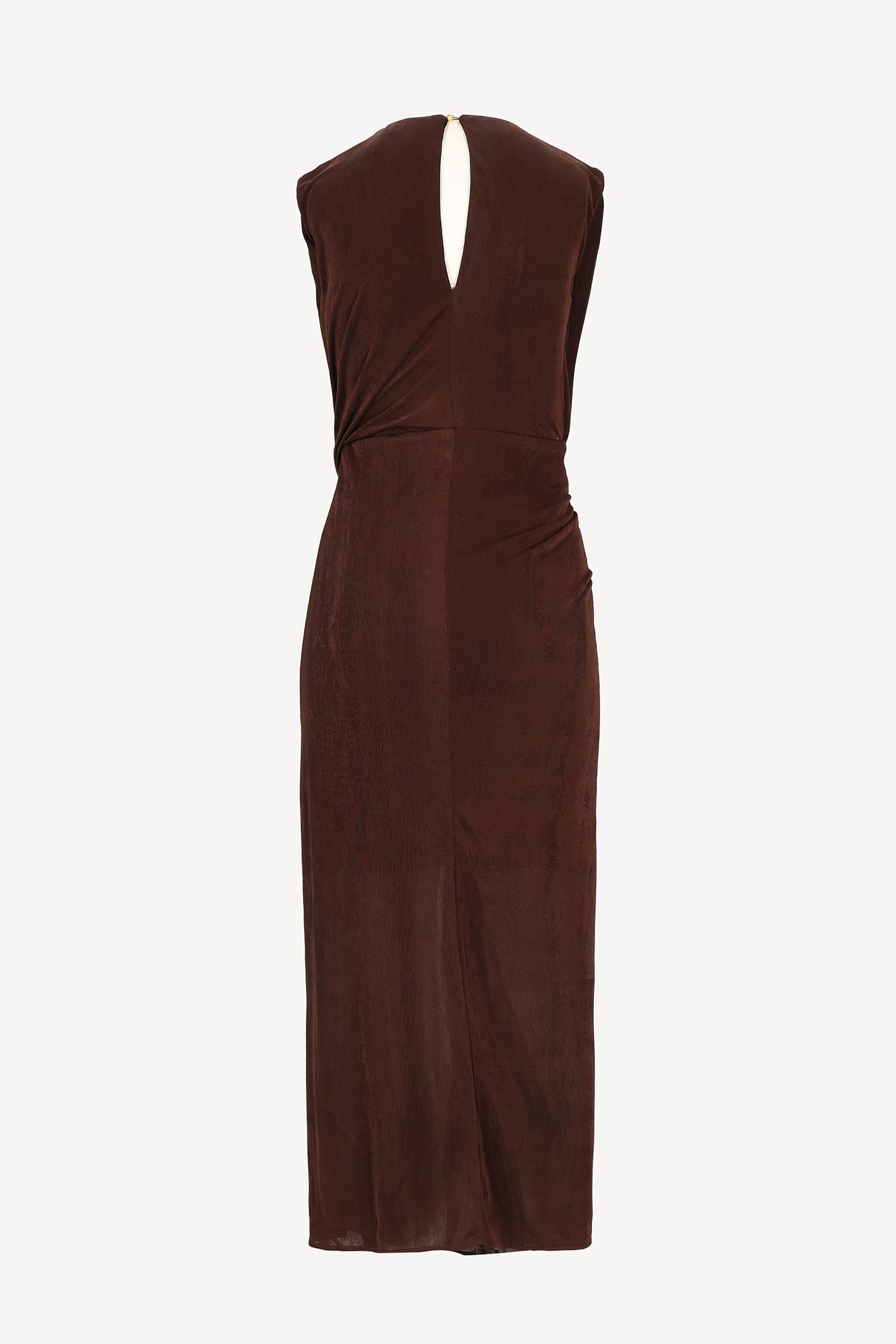 Elegancka sukienka maxi w odcieniu głębokiego brązu to wyjątkowa propozycja na wieczór, specjalne wyjścia i eleganckie okazje. Delikatne drapowania subtelnie podkreślają sylwetkę, a dekoracyjna klamra akcentuje linię talii, dodając kreacji biżuteryjnego wykończenia. Sukienka pięknie opływa ciało, miękko układa się przy każdym ruchu i tworzy efekt wysmuklenia. Długość maxi nadaje całości ekskluzywny, ponadczasowy charakter. Z tyłu znajduje się subtelne wycięcie zapinane na guzik, które dodaje lekkości i elegancji.